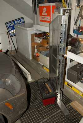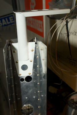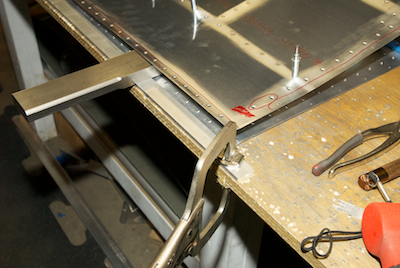 Here is another picture of the bucking bar and its use when putting the second skin on. The second skin already has the rib halves back riveted on. Note that the bucking bar is raised about an eighth of an inch so that you don’t crease the bend for the wedge. After riveting the rib halves to each other with blind rivets you insert the forward spar and rivet it to the skins with the squeezer. You then have a substantially completed elevator ready for the final work. |