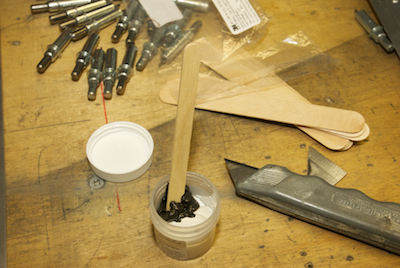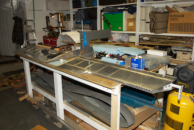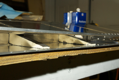 The first picture shows everything in place including pre arranged paper towels and extra sets of gloves. The second picture shows the two parts just before mixing. Once it’s mixed it has 30 minutes of working time. The third picture shows the two ribs in the left elevator in place with the skins about to be clecoed together. The last picture shows the completed job 30 minutes later. The weights are left on for two day for curing. |