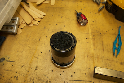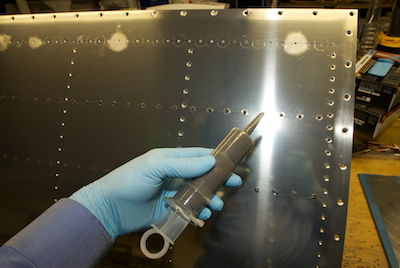 One last feature. The two cans containing the two parts each have some velcro attached so you can keep the two containers together. With some sealant mixed it was time to start riveting stuff to the skins. You start by back riveting the 11 stiffeners. I used my usual technique except I applied a dollop of sealant to each rivet hole and inserted the rivet. Then before applying tape over the rivets, I cleaned off the excess. Next I put a layer of sealant on the faying surface of the stiffener and put it in place. I also used my mixing sticks to burnish the upper surface of the stiffener to squeeze out the excess sealant. |