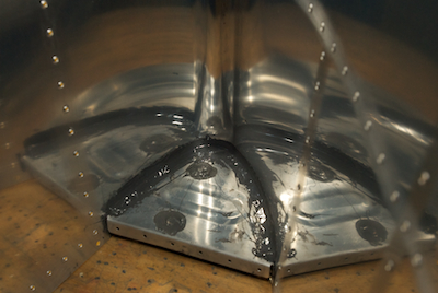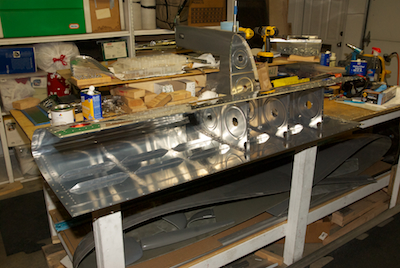 Then it is time to start installing the ribs, starting with the inboard partial rib. The inboard and outboard ribs get a heavy bead of sealant around there edges. The first picture below shows a layer of sealant on the flange of a rib before going into the tank. Unfortunately, I found it quite difficult to concentrate on installing the rib and taking pictures so there are no pictures of the process. Basically, after the rib was buttered up, I slide it in place and attached it with clecos in every other hole. Every hole near the nose of the skin. Then, no more than a few at a time, I put some sealant in the hole, inserted the rivet and bucked it into place. The end rib rivets could be squeezed by all the others were bucked. I then took out a small group of clecos, cleaning each as I took it out and then riveted those holes following the steps above. After I was done with a batch of sealant, I went back and cleaned up the areas of sealant that got into the J channel area and the baffle area. |