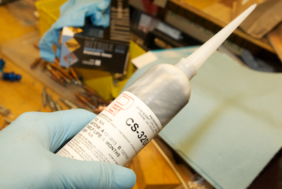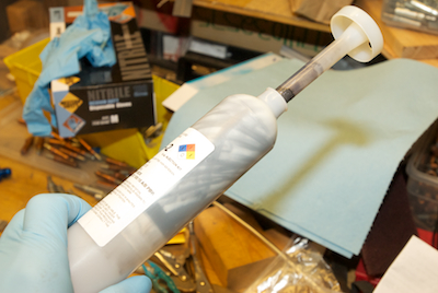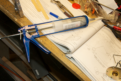 The sealant can also be purchased in a tube. I had bought one earlier and it was about to expire so I decided to use it up by installing both othe the final ribs in one go. The tube has the same two hour working time and it fits in the gun I bought for it. It worked very well but I liked being able to mix a specific amount and the syringe was just as good. If I was to do it again I don’t think I would use the tubes. They are nice but my setup worked very well. The last rib is in place in the last picture and it also has the fuel level sender installed. You do one dry install to git the float wire then you install it with sealant. |