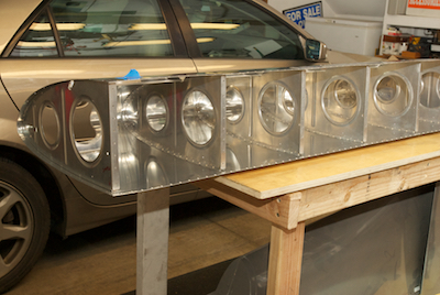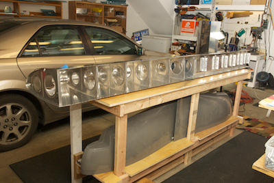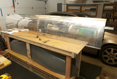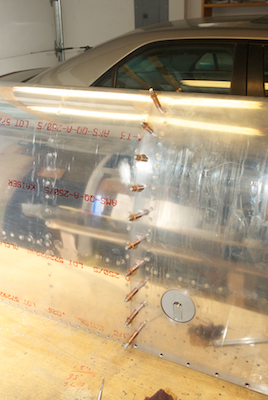 After both leading edges are done it was time to play again. The first two pictures show the left tank and the left leading edge connected with clecos. This gives you the length of the wing except for the fiberglass wing tip. The small portion of structure sticking out at the right side of the fuel tank is the small gap that is between the fuselage structure and the wing. This space is used to make connections between the wing and the fuselage and will be covered by a narrow piece of wing skin. The bottom two pictures show the pieces from the rear after I removed the clecos and positioned them for flight. The dimples held them together nicely. They are attached to the spar with rivets and bolts. |