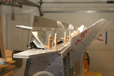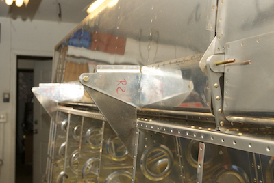 I just slipped them in place with unsecured bolts and taped them to each other and the wing to see how they looked. After that diversion, I attached a long baffle type piece to the aft end of the skin and rear spar. It stiffens the skin that hangs over the flange of the rear spar and creates a pocket that the leading edge of the flap and aileron nest in. |