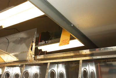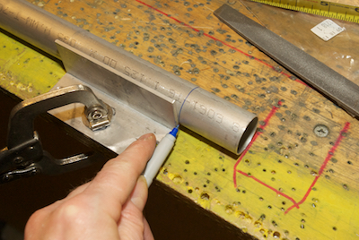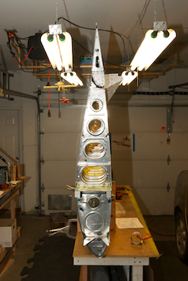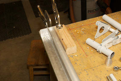 With the wing together vertically on the table, it is not possible to install the aileron or wing tip and open the garage door. To make sure I don’t forget, I taped a piece of cardboard to a support above the door that indicating where the open door will go. I want to be able to install the aileron to rig the wing so when ever I have something attached I’ve decided to pull the power from the garage door opener. To rig the wing I need to make all the push rods and torque tubes. My measuring jig is shown in these two pictures below. |