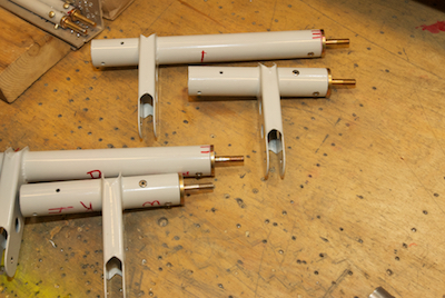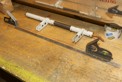 I also made up both torque tube mechanisms. First you add the ends, then you install one end of the unpainted tube. You attach the other end to the middle tube and adjust it to the correct length The last two pictures show the fitting of the last piece of the assembly in place. In picture number four you can see that one of the brackets lies flat against the table while the other bracket is raised a fixed amount from the table to the bolt that runs through it. I cut a piece of plywood to the correct height and supported that end while drilling. |