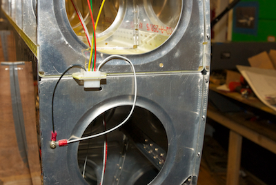 I also took advantage of an empty hole in the molex connector and used the pins that came with the light to add the second ground from the light case to the connector and then to the prewired ground. The last two pictures show the work at the forward corners where the two bottom skins overlap. These get filed down and primed just like the top skins. |