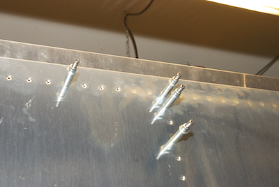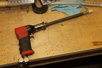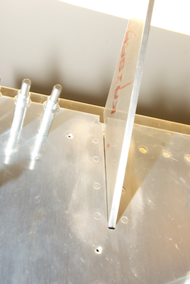 Kathy helped get me started on the inboard bottom skin. I bucked and she riveted along the top row and around the flap bracket. It went well and I was able to finish the inboard skin on my own. Very slowly but it worked fine. We used the small back rivet set around the flap bracket but the two top row rivets - one on either side - needed the long back rivet set shown in the last picture. |