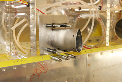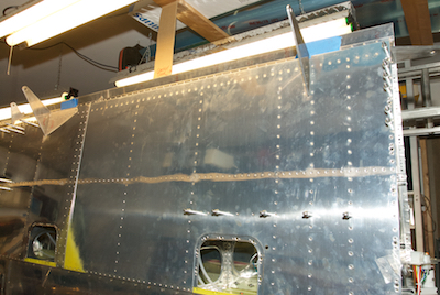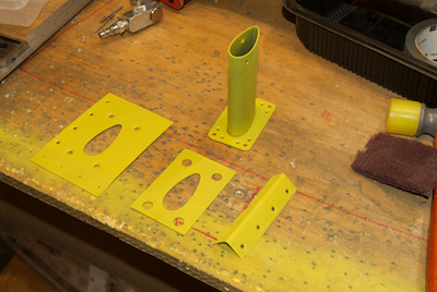 Kathy then helped me with the hard to get to rivets on the inboard section of skin. Then I realized that the default pitot installation was not going to be what I wanted. I will use either the Garmin or Dynon pitot so I need a mast for it to mount to. I ordered one so I could install it before riveting the outboard skin. The mast and mounting plates are steel so I had to prime them and I primed the mating surfaces of the aluminum angle piece and the rear of the spar as well. |