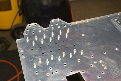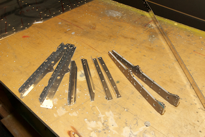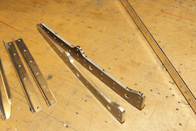 Some doubler plates are added to the skin as seen in the first two pictures. The last two pictures show a complicated stringer that will be assembled from these parts and attached to the fuselage skin. As usual I have included a picture of two of the thick pieces of plate that are in the process of having the edges smoothed. |