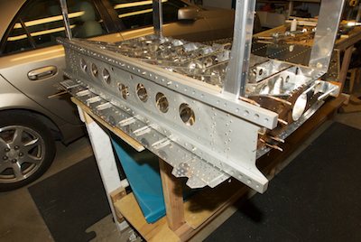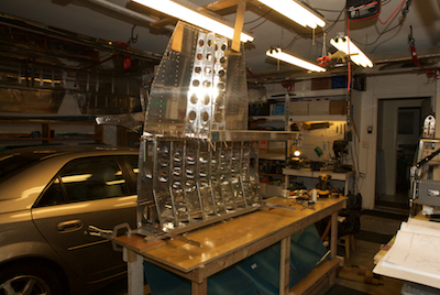 With all the prep work of the aft main spar, rear spar, ribs and skin it is time to start assembling the seating area. The bottom of the seat will be supported by the ribs between the main spar and rear spar as shown in the first picture. To rivet it together, I stood the whole thing up on the spar. This worked very nicely. The last two pictures show some hard to get to rivets. The first rivet is hard to buck, but it can be done. The second one is a hard to reach pulled rivet. You can see my little angle tool over the rivet and the contortions my rivet puller can achieve. |