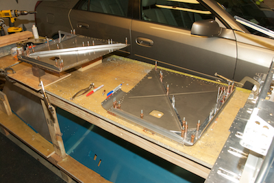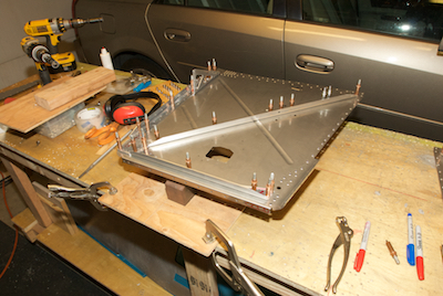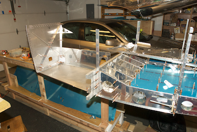 The first picture is some playing around to get a feel for the overall length of the fuselage. I have clecoed the forward skins and firewall to the rear skin just to get a look preview of things to come. In the last two pictures I have started to rivet a number of stiffeners to the left and right firewall sections. |