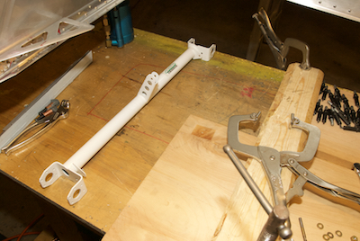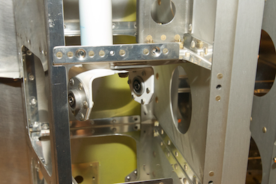 The piece in the first two pictures is one of the control arms. It connects the two sticks together and rotates in two bearings to provide the pitch control. It needs to be installed now because once the skin goes on, it can’t go in without cutting large holes in the sides. Some bearing have been attached in the last two pictures to each end for mounting the sticks. The sticks can then rotate left or right in those bearings to provide roll control. |