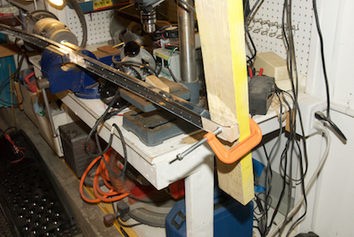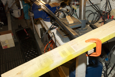 There are two longerons that run along the top of the side skins from the firewall into the aft fuselage. They come mostly fully formed and pilot drilled. You do have to induce a permanent 10° bend in the the pieces. The manual tells you were to start the bend. You clamp it in the vice at the bending point and then clamp a board to the firewall end and twist. I had to twist the piece over 130° before it took the permanent bend. It is shown test fitted in the third picture. The two blocks of wood used for clamping are shown in the last picture. These wood pieces and the piece that goes between the spars were made from hard maple by my son-in-law. |