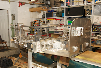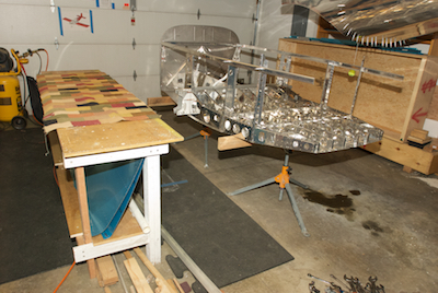 With all that completed, it was time to rearrange things in the workshop. I first moved the structure to two sawhorses standing where the car goes. I then removed the two side skins that have been stored under the table since the kit arrived and then rearranged my tables and rolling tool chest. The dimple station has been moved closer to the garage door and the table has been moved into the spot where the tool chest was (the chest is now positioned in front of the parked car and a tennis ball has been placed hanging from the ceiling to allow precise car positioning). Since I stored scrap wood under the table all of that had to be moved along with the standing mats. A general clean up followed. |