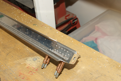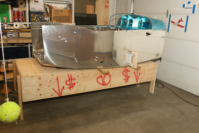 Where did I temporarily store the side skins after I removed them from their storage spot? Why on the fuselage of course as seen in the first picture. It was my first look at the fuselage with skins. I even had the panel area clecoed together. It looked terrific. I then made a short table out of the fuselage kit shipping container. Although it is made of thin plywood it has a very strong inner structure. I added the 2 x 4’s with doublers on the inside and it is a remarkable strong and stable platform. I determined the height by making the top of the side skin come up to a comfortable position below my arm pit so that I could reach in to buck rivets all the way to the floor. It is an excellent height and worked out great. The last picture shows work on the short lower longeron sections. They needed to have some cuts made to them as well and some match drilling for the milled aluminum piece shown in the last two pictures. |