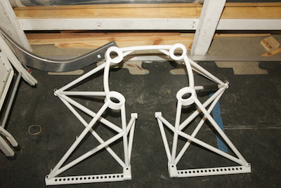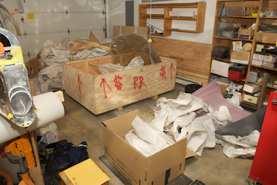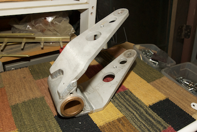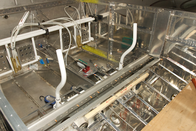 The sticks have been installed in the first picture as well as all the brake lines after - ahem - waiting for more replacement parts. In early April I received the finish kit. I took time out to unpack and inventory all the new items including the engine mount the first gear leg mount, canopy and cowling, as shown in the remaining pictures. |