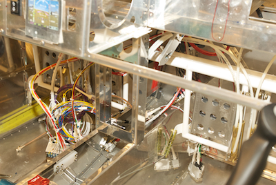 I also had to start snaking the avionics harness into position to start connecting the mounted hardware. The second picture shows the harness being attached to the navigator and radio. The third and fourth pictures show all the attachments between the PFD, ADAHRS, engine interface etc, in the left side avionics bay. |