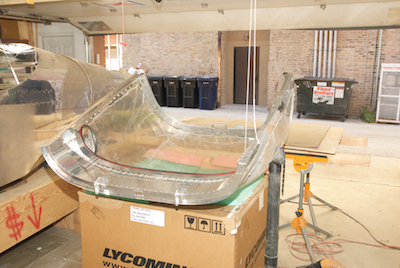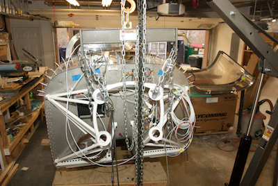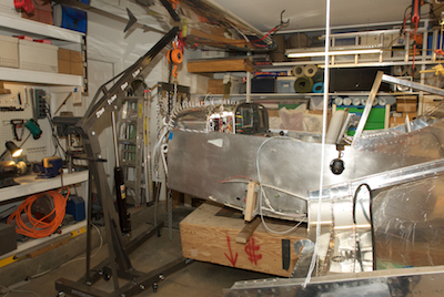 Yeah! Done with the panel. Time to move on to the landing gear. I’ve been working on the airplane while it sits on the table I made from the fuselage kit crate. It is not possible to put the legs on because the table is too low and blocks access to the fuselage floor where the gear legs go. I had to lift up the fuselage and put it on supports a couple of inches higher. To do that, I used my new shop crane to lift the fuselage and put the supports under it. It took some rearranging as the supports were holding up a temp table with the canopy on it. I moved things around and now I could work on the gear. |