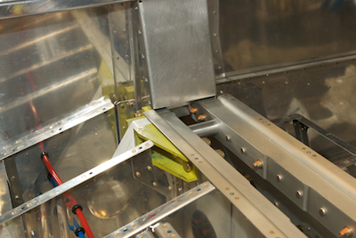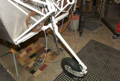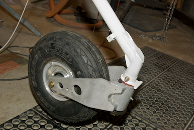 Next I attached the wheel pivot arm and wheel next. There is a nut that goes on the bottom threads of the gear leg. You tighten the nut until it take 26 pounds of force to move the pivot arm at the axle attach point. I bought a 50 pound digital fish scale to measure it with. The last two pictures show the gear legs attached to the spar with several support pieces. It is a nice set of well engineered parts that hold it all together. |