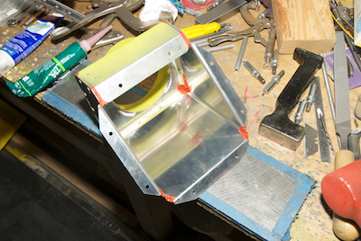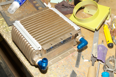 The oil cooler needed preparation before it was installed. The fittings have been attached and clocked in the first picture. The second picture shows some rubber gasket material that has been attached with silicone adhesive to create a seal between the cooler and the vent that will attach to it. Pictures three and four show that vent after it has been assembled and all the holes plunged with RTV. |
