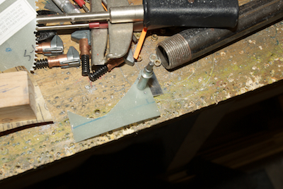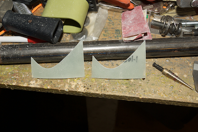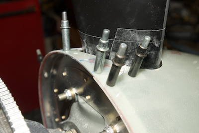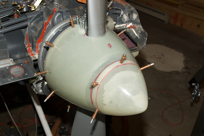 The spinner needed to have several locations marked on it and then some interior sanding followed by a thin coating of epoxy resin in the marked areas to allow for nice smooth contact with the spinner fore and aft plates. Then using a template, the two cut out pieces are further cut back to make the pieces of the spinner that sit behind the prop. The piece is being fitted in the third picture. The last picture shows all the holes drilled and the spinner held in position. |
